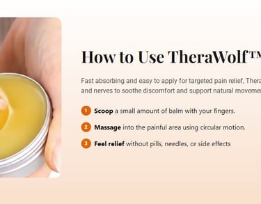 TheraWolf Balm is a natural, fast-absorbing topical pain relief balm formulated to help soothe sore muscles, stiff joints, and inflammation. Designed for external use, it delivers targeted relief directly to the affected area without the need for oral painkillers. Unlike temporary numbing creams, TheraWolf Balm focuses on supporting circulation, reducing tension, and calming inflammation at the source of discomfort. This makes it an excellent option for people seeking long-term relief without harsh chemicals or dependency.